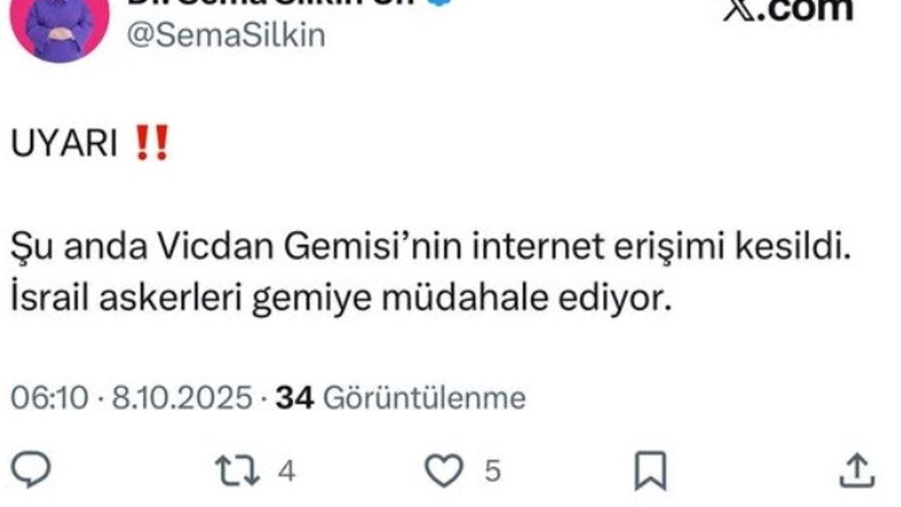 Gazze'ye insani yardım ulaştırmak amacıyla Akdeniz'de yol alan Vicdan gemisine, sabah saatlerinde İsrail askerleri tarafından müdahale edildi. Gemide Denizli Milletvekili Sema Silkin Ün'ün de bulunduğu bildirildi. Müdahale öncesinde internet erişimi kesilen gemide yaşananlara ilişkin henüz resmi bir açıklama yapılmadı.