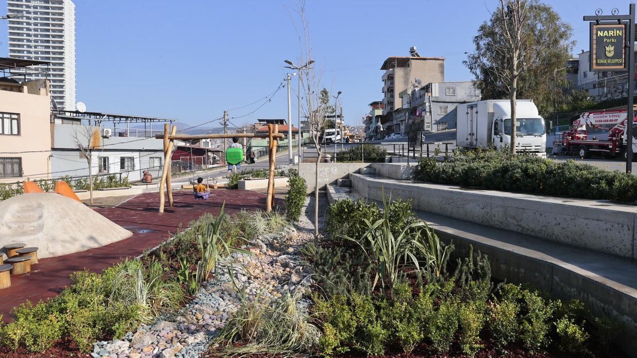 Diyarbakır'da katledilen 8 yaşındaki Narin Güran'ın adını taşıyan parkta gerçekleştirilen özenli çalışmayla, bitki örtüsü ve peyzaj yenilenirken yağmur suyunun yüzeyden akıp kaybolmasını önlemek amacıyla tasarlanmış özel bir peyzaj uygulaması olan yağmur bahçesi de oluşturuldu. Yağmur suyunun belirli bir alanda toplanarak bitkiler ve geçirgen toprak katmanları sayesinde süzülüp toprağa sızdırılmasını sağlayan sistemle suyun bereketi artacak. Narin Parkı'nda başlayan uygulama Konak'ta yenilemesi yapılacak diğer parklarda da uygulanacak.