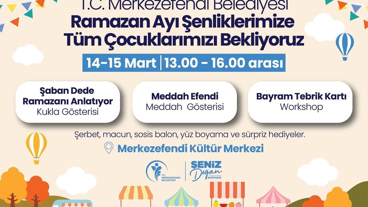 Merkezefendi Belediyesi, Ramazan ayının birlik, beraberlik ve paylaşma ruhunu çocuklara yaşatmak amacıyla Ramazan Şenliği düzenliyor. 14 ve 15 Mart tarihlerinde Merkezefendi Kültür Merkezi'nde gerçekleştirilecek şenlik, 13.00 ile 16.00 saatleri arasında çocukları eğlenceli ve öğretici etkinliklerle buluşturacak.