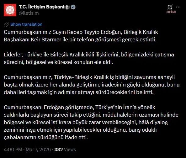 'Cumhurbaşkanımız Sayın Recep Tayyip Erdoğan, Birleşik Krallık Başbakanı Keir Starmer ile bir telefon görüşmesi gerçekleştirdi. Liderler, Türkiye ile Birleşik Krallık ikili ilişkilerini, bölgemizdeki çatışma sürecini, bölgesel ve küresel konuları ele aldı. Cumhurbaşkanımız, Türkiye-Birleşik Krallık iş birliğini savunma sanayi başta olmak üzere her alanda geliştirme iradesinin güçlü olduğunu, bunu daha ileri taşımak için adımlar atmayı sürdüreceklerini belirtti.